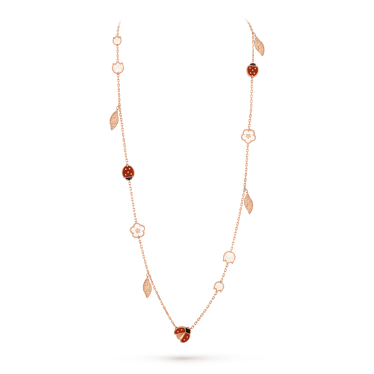 Lucky Spring long necklace, 15 motifs, 18K rose gold, white mother-of-pearl, carnelian, onyx. REFERENCE VCARP7RT00...