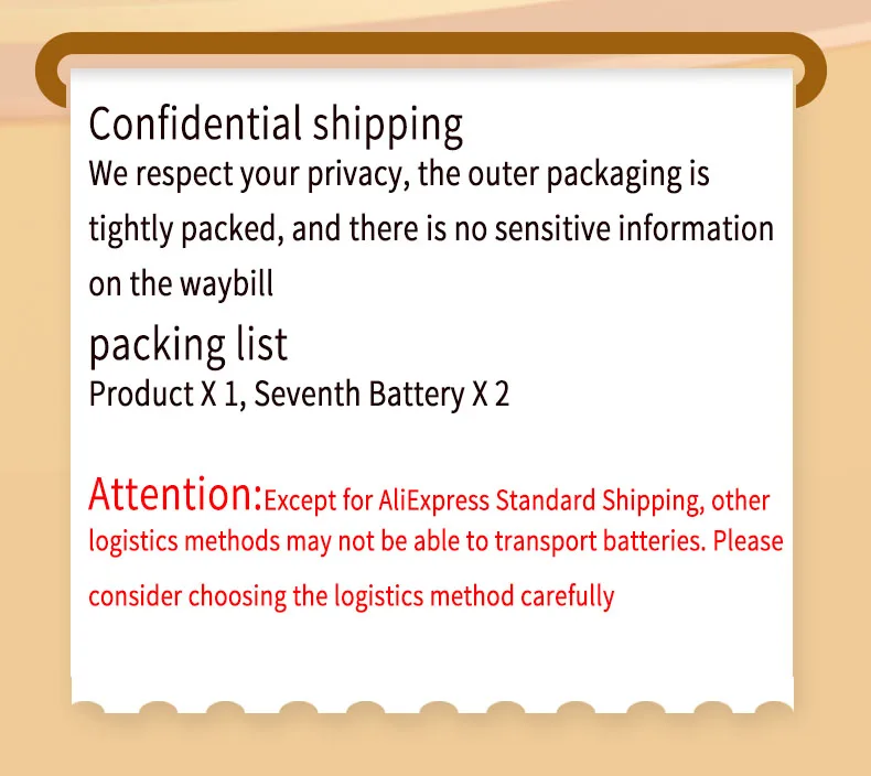 Attention: Except for AliExpress Standard Shipping, other logistics methods may not be able to transport batteries. Please consider choosing the logistics method carefully