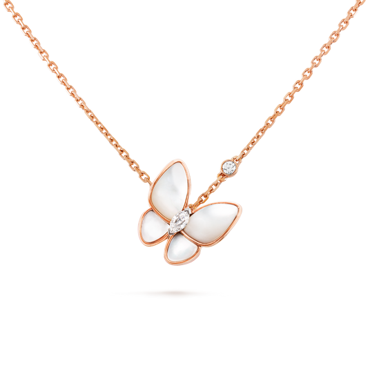 双蝴蝶吊坠,18K 玫瑰金,白色珍珠母贝,圆形钻石,镀铑 18K 白金,马眼形钻石,DEF、IF 至 VVS 级钻石。吊坠与项链链相连 参考 VCARO8FO00 石头 宝石钻石:2 颗,0.2 克拉 宝石珍珠母贝:4 颗宝石...