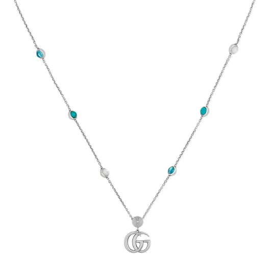 The double G, the brand's classic logo, is suspended on a silver necklace, and mother-of-pearl,...