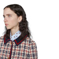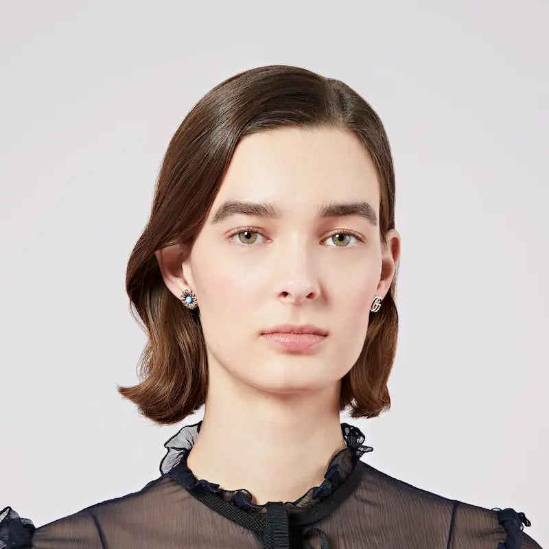 In Gucci's kaleidoscopic world, a fascination with the natural world is mixed with various elements that reflect a respect for the brand's tradition. One earring is the brand's classic double G pattern, and the other is a flower shape with a blue topaz in the center.