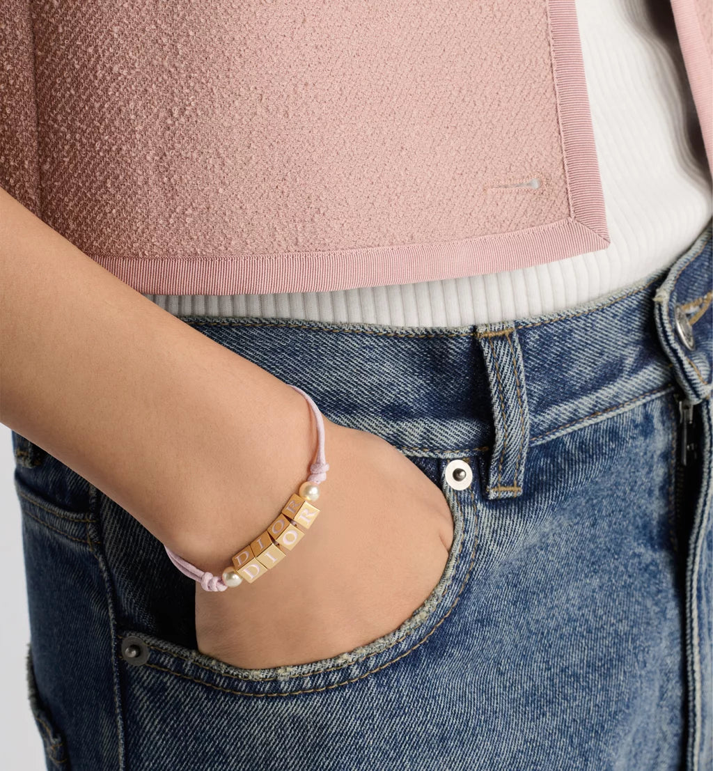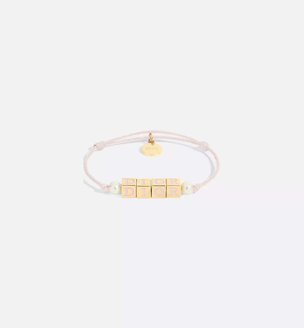 New to the Spring-Summer 2025 Ready-to-Wear collection, this D-Dice bracelet pays homage to the Dior signature with a playful twist. Pale pink cotton cord with gold-finish metal dice, adorned with a pale pink lacquered Dior logo and a white resin bead on each side. A vibrant color that coordinates with other pieces from the D-Dice collection.