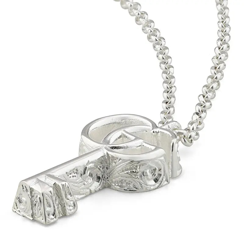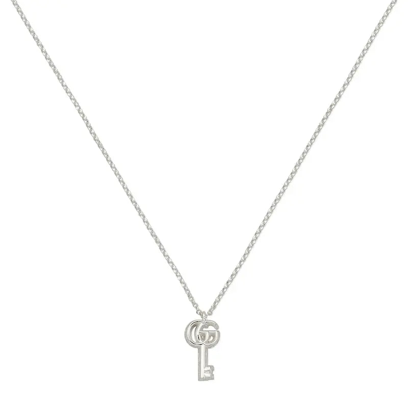 This silver necklace cleverly integrates a key pendant with the iconic double G element in the center, highlighting the design ingenuity. Gucci's silver jewelry series adheres to the craftsmanship and exquisite design, highlighting the brand's characteristics in an understated way, creating a series of pieces full of contemporary style and classic elements.