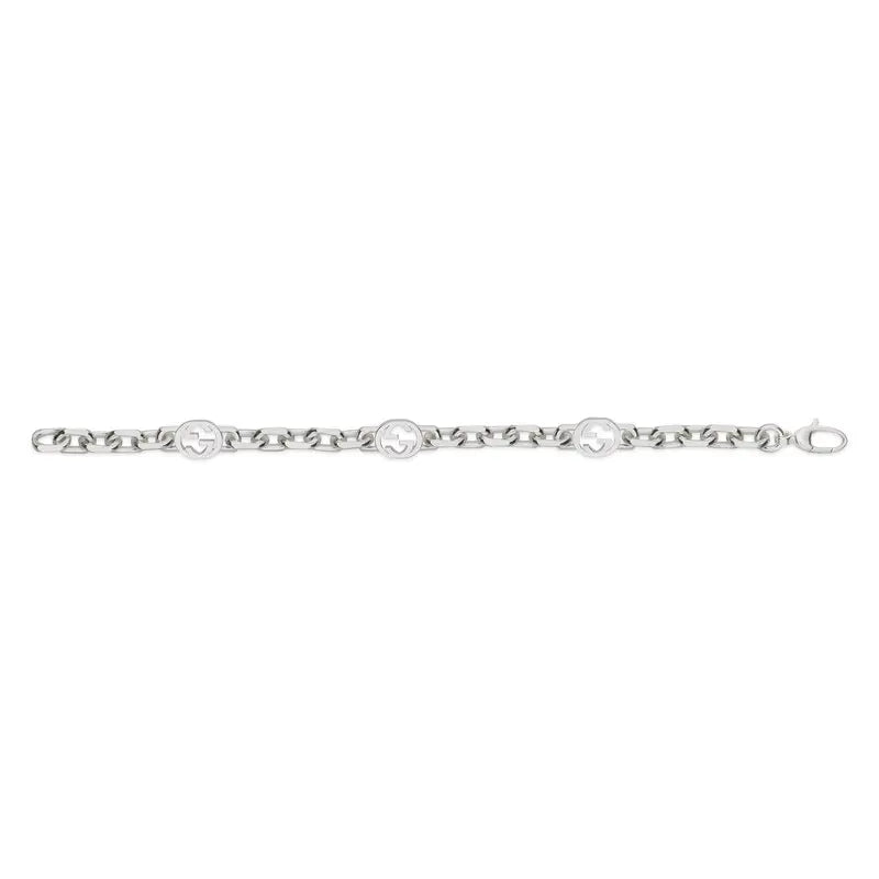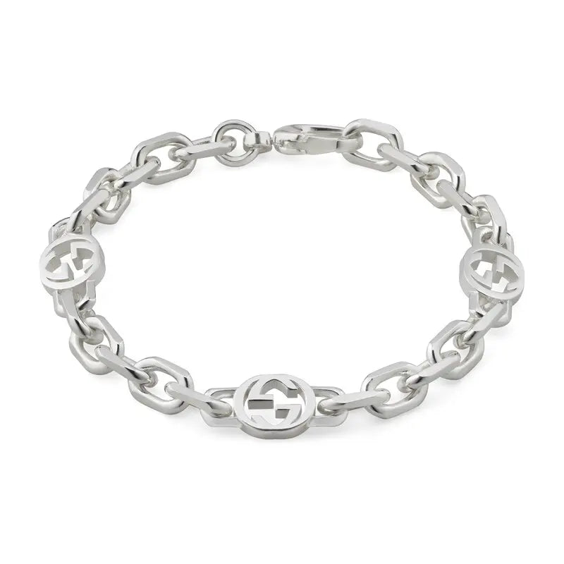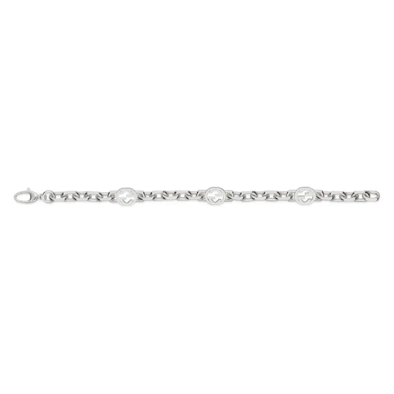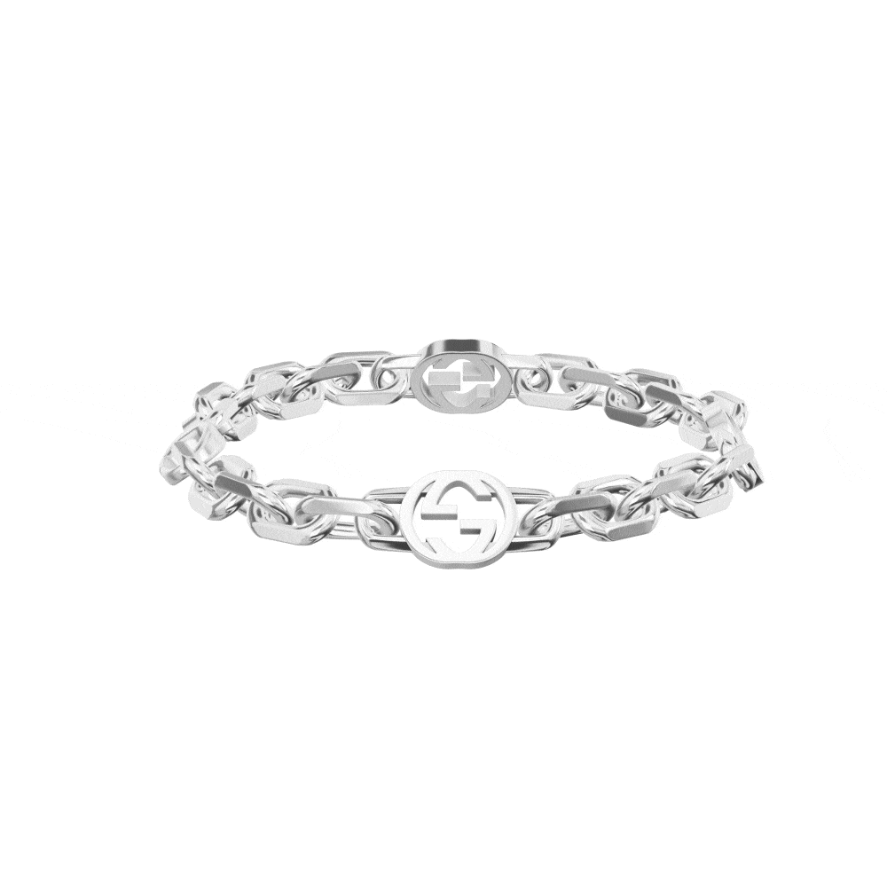 Three interlocking G motifs give this bracelet a visual twist. Crafted in shiny silver, this piece features a thick chain and clasp for a stylish twist.