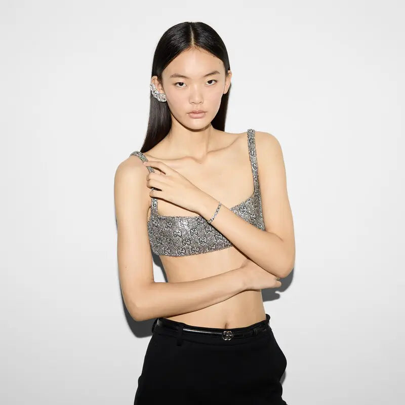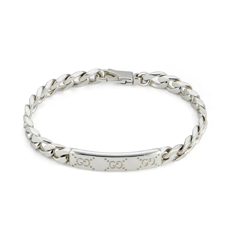 The GG pattern is reinterpreted on a variety of everyday items, showing a modern style and a casual tone. The dazzling silver base is coated to create an anti-oxidation effect, and is carefully embellished with engraved logos and polka dot designs. The GG pattern label pendant injects rich charm into this bracelet.