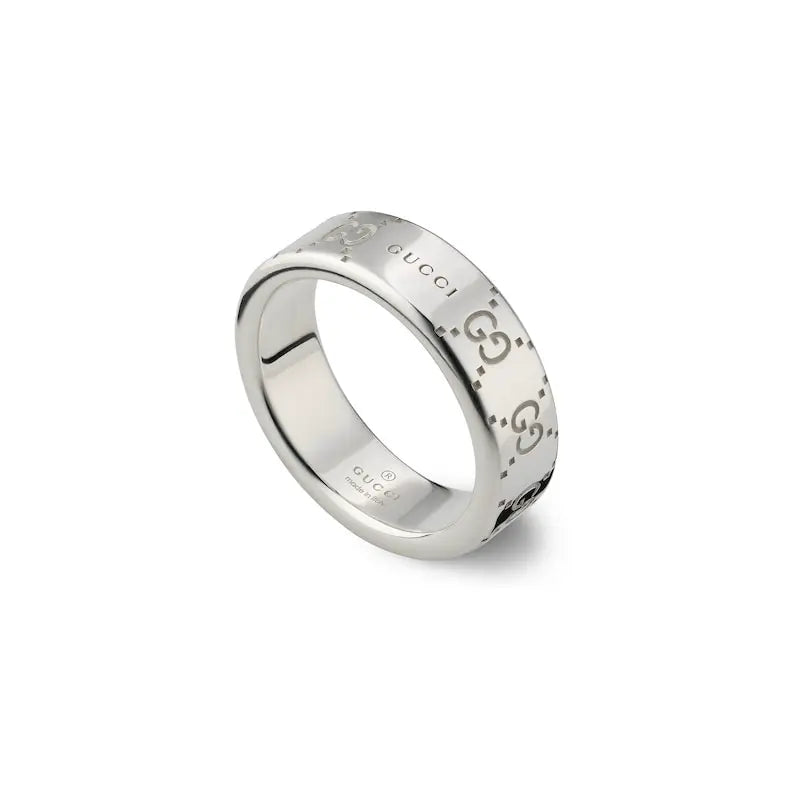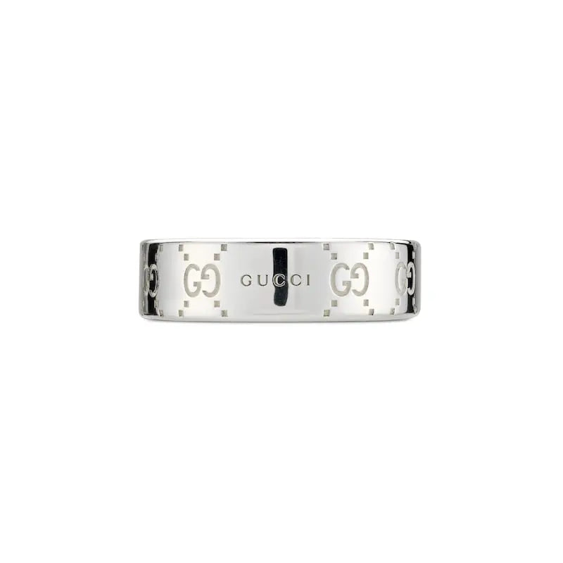 The GG pattern reinterprets a variety of everyday items, showing a modern style and a casual tone. The dazzling silver base is coated to create an anti-oxidation effect, and is carefully embellished with an engraved logo and polka dot design. The GG pattern injects rich charm into this wide ring.