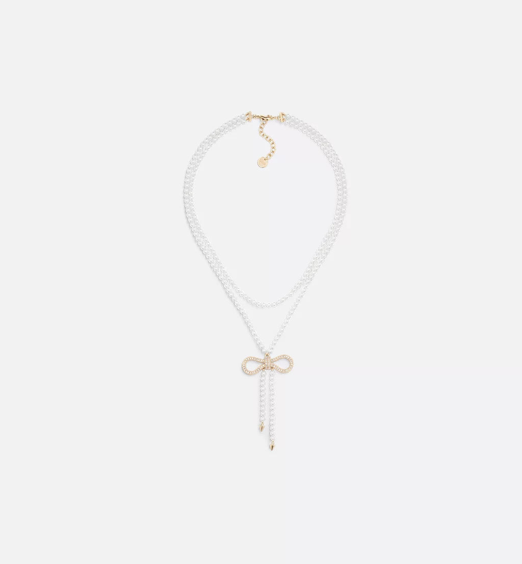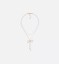 This Le Nœud de Dior necklace pays homage to Dior's heritage and elegant, timeless icon. Crafted with white resin beads, it features a double-strand design with a signature bow in champagne-finish metal embellished with pavé-set silver-tone reflective crystals. This elegant silhouette will enhance any look and coordinates with other pieces from the Le Nœud de Dior collection.