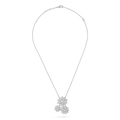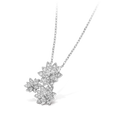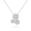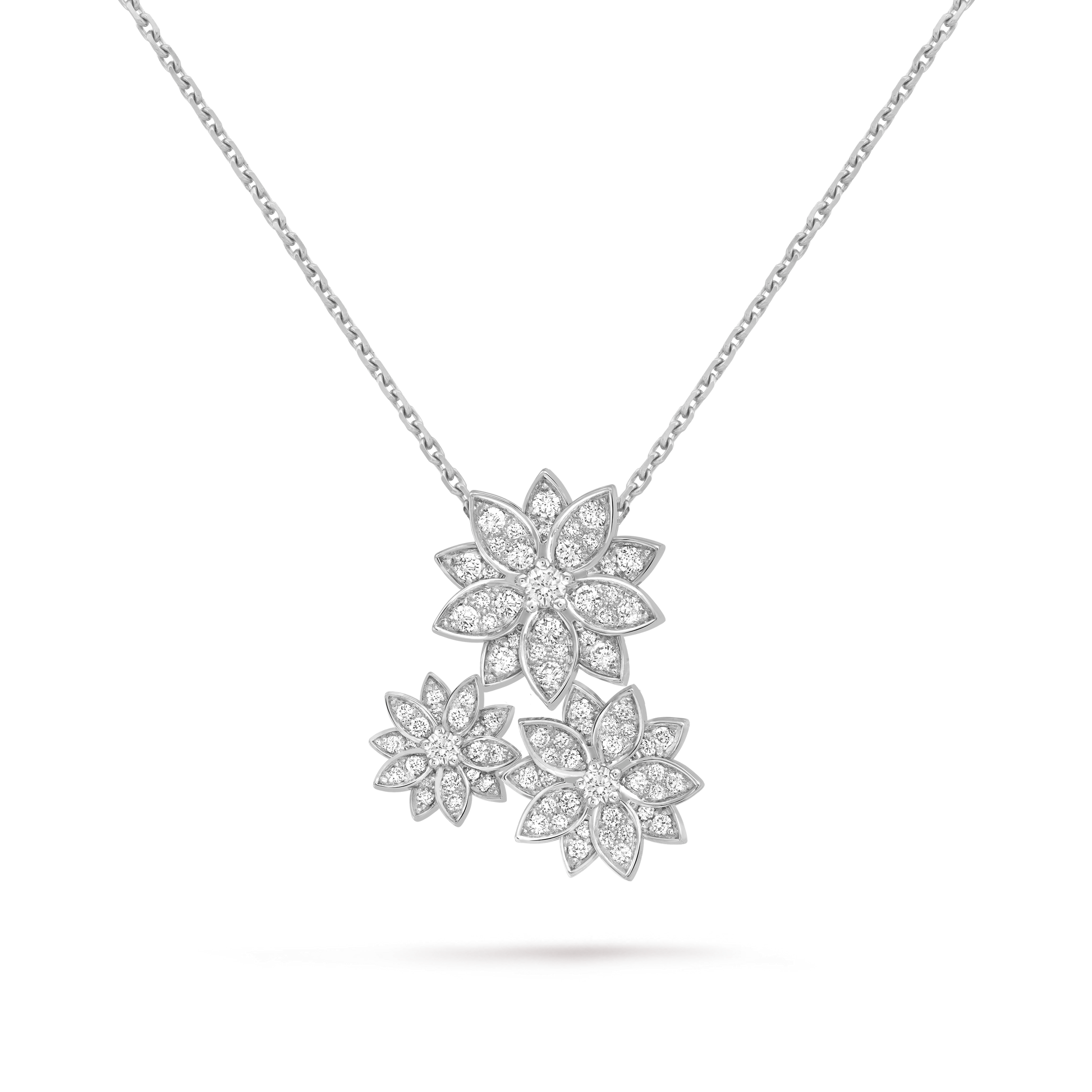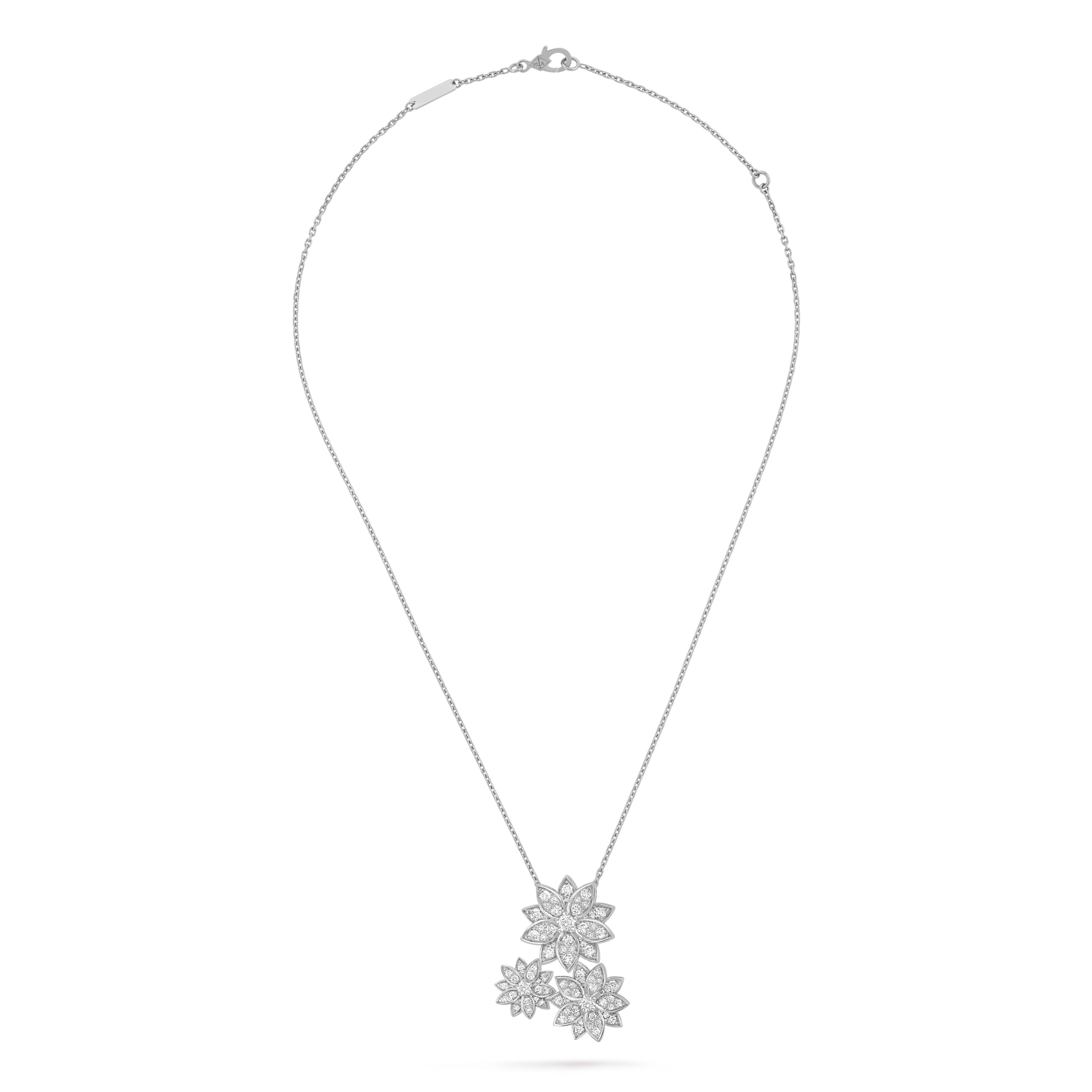 莲花吊坠,3 朵花,18K 镀铑白金,圆形钻石;钻石品质 DEF、IF 至 VVS。吊坠与项链链相连