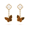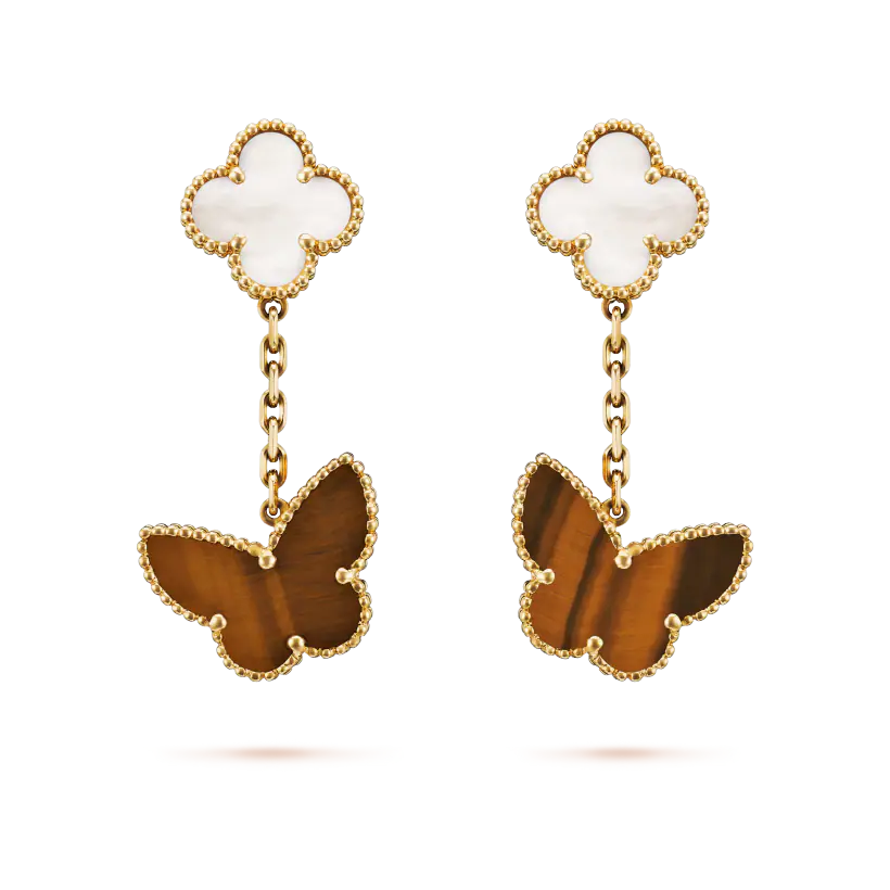 Lucky Alhambra earrings, 2 motifs, 18K yellow gold, white mother-of-pearl, tiger's eye.