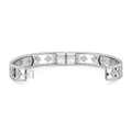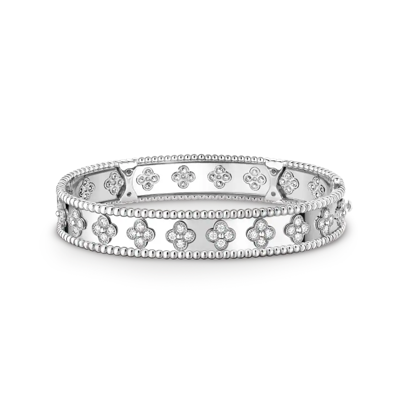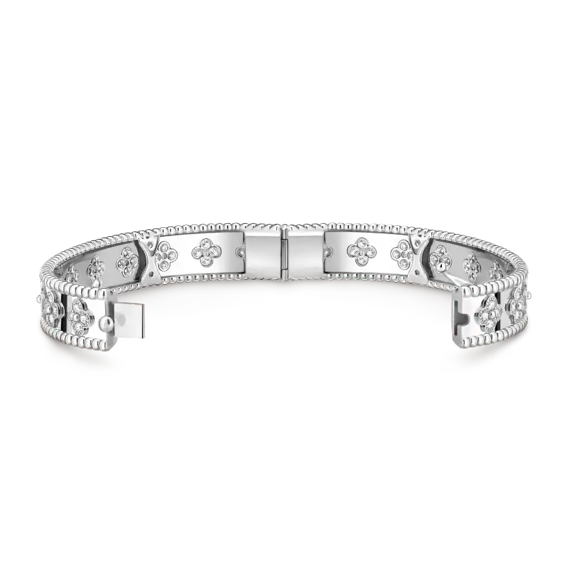 Perlée clovers bracelet, rhodium-plated 18K white gold, round diamonds, medium model; diamond quality DEF, IF to VVS.