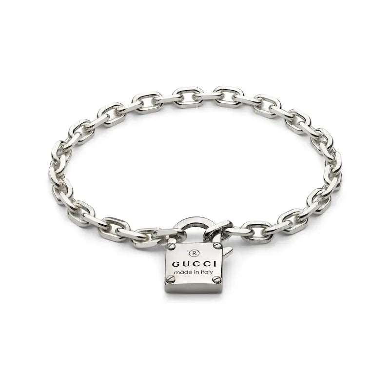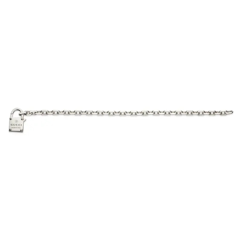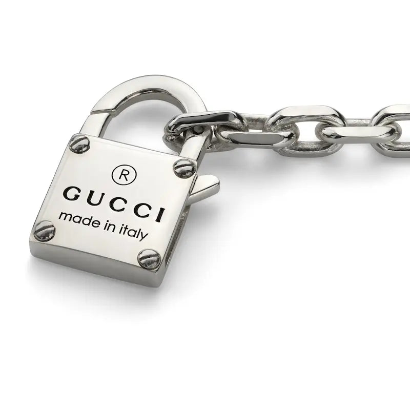 The Gucci Trademark collection subtly celebrates the brand name with a variety of motifs and hexagonal bolt charms. The Pre-Fall 2024 collection features playful elements such as hollow hearts and padlock charms, which add a touch of chic charm to a selection of rings, necklaces, bracelets and earrings. This silver bracelet is embellished with a Gucci Trademark engraved padlock.
