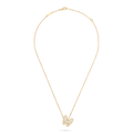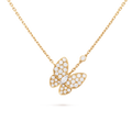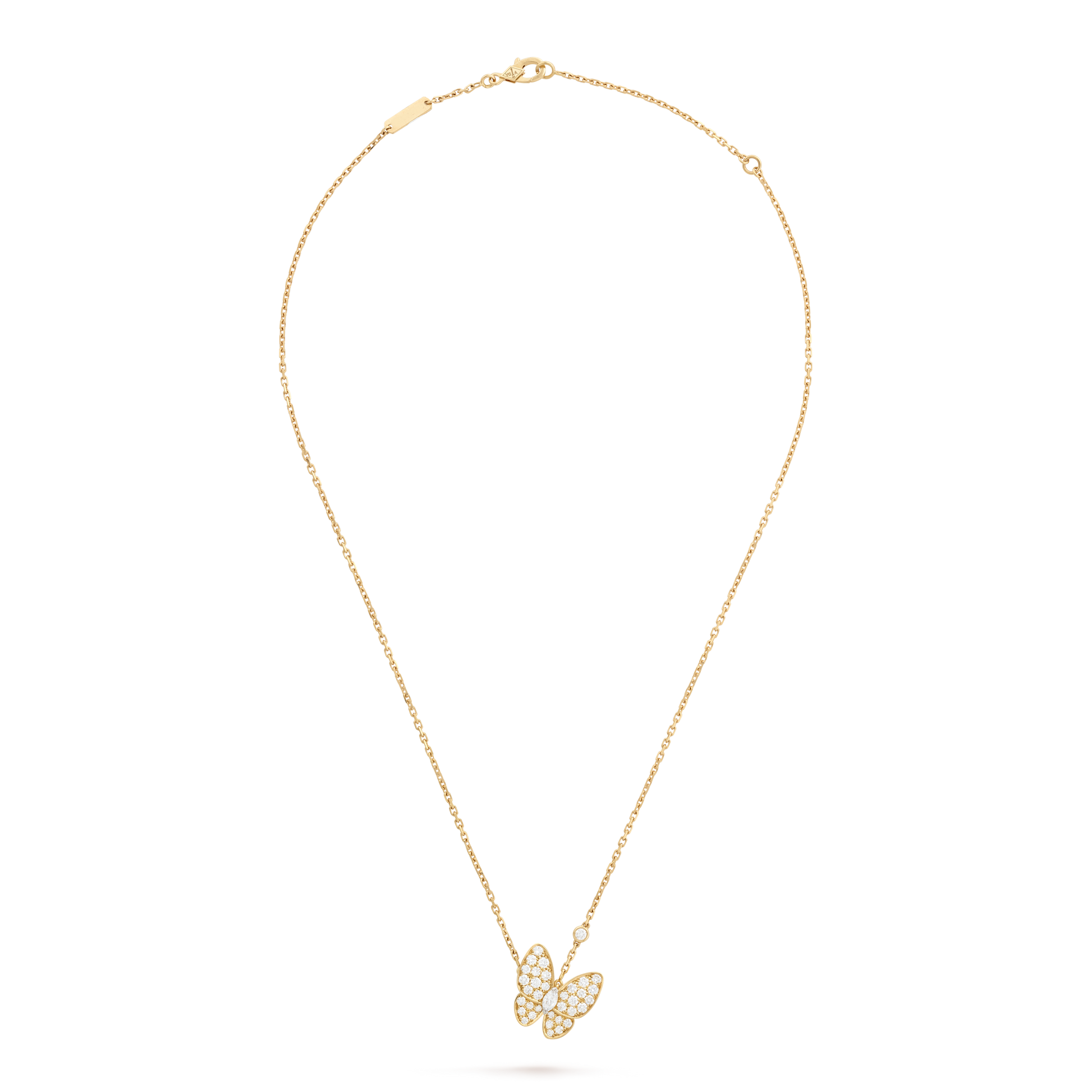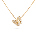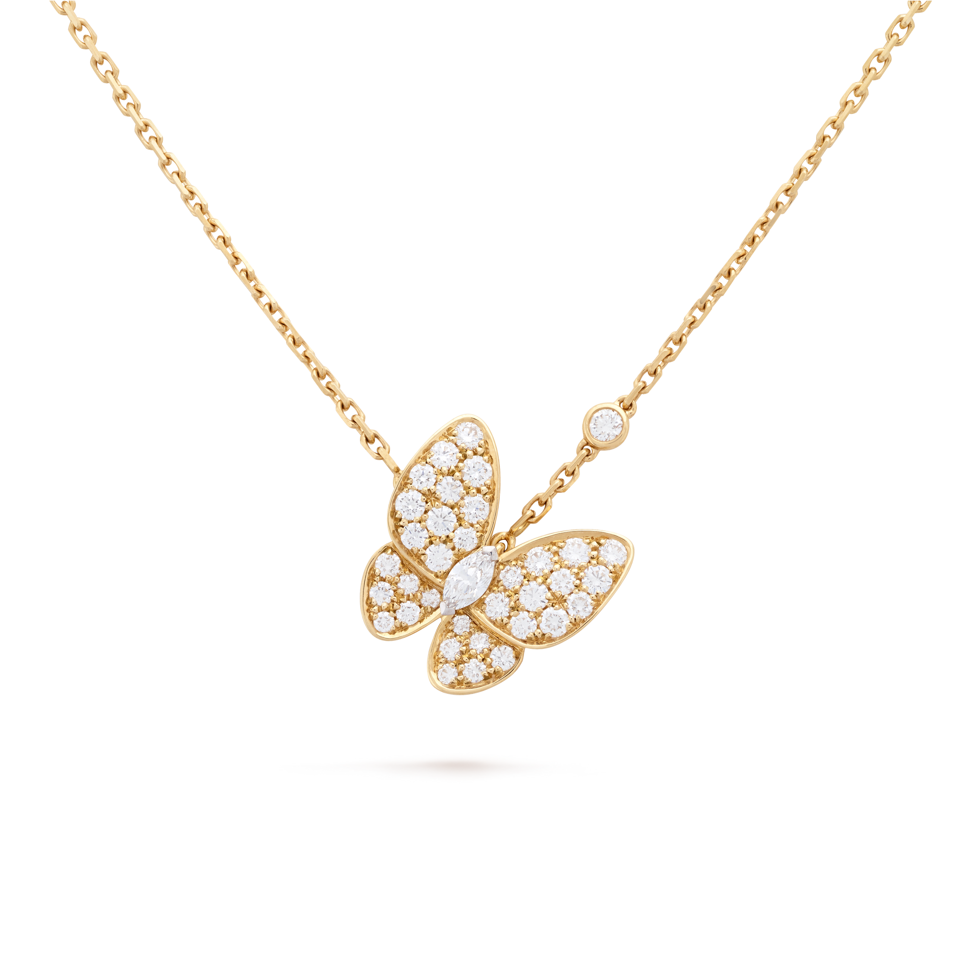 双蝴蝶吊坠,18K 黄金,圆形钻石,镀铑 18K 白金,马眼形切割钻石;钻石品质 DEF、IF 至 VVS。吊坠与项链链相连