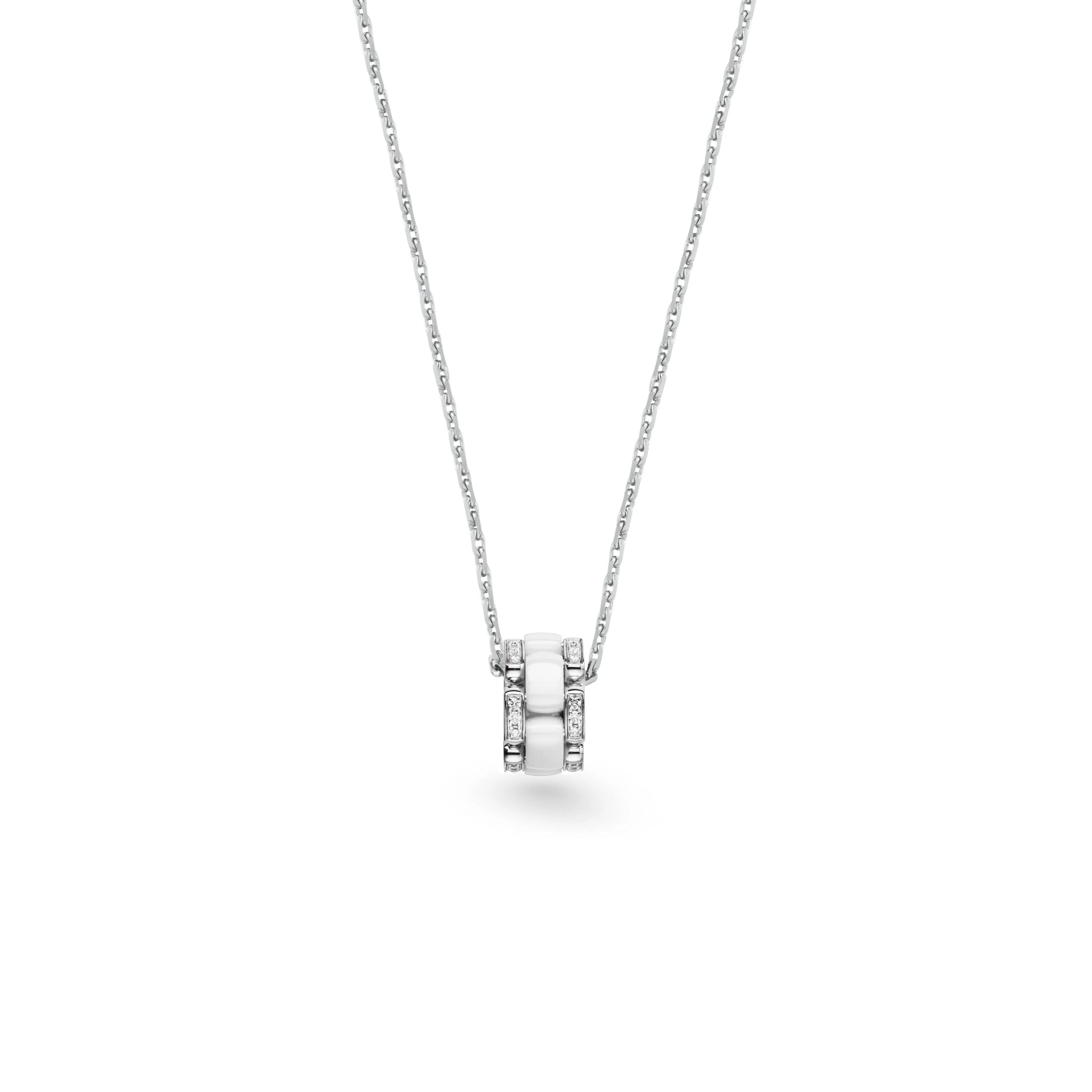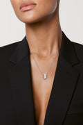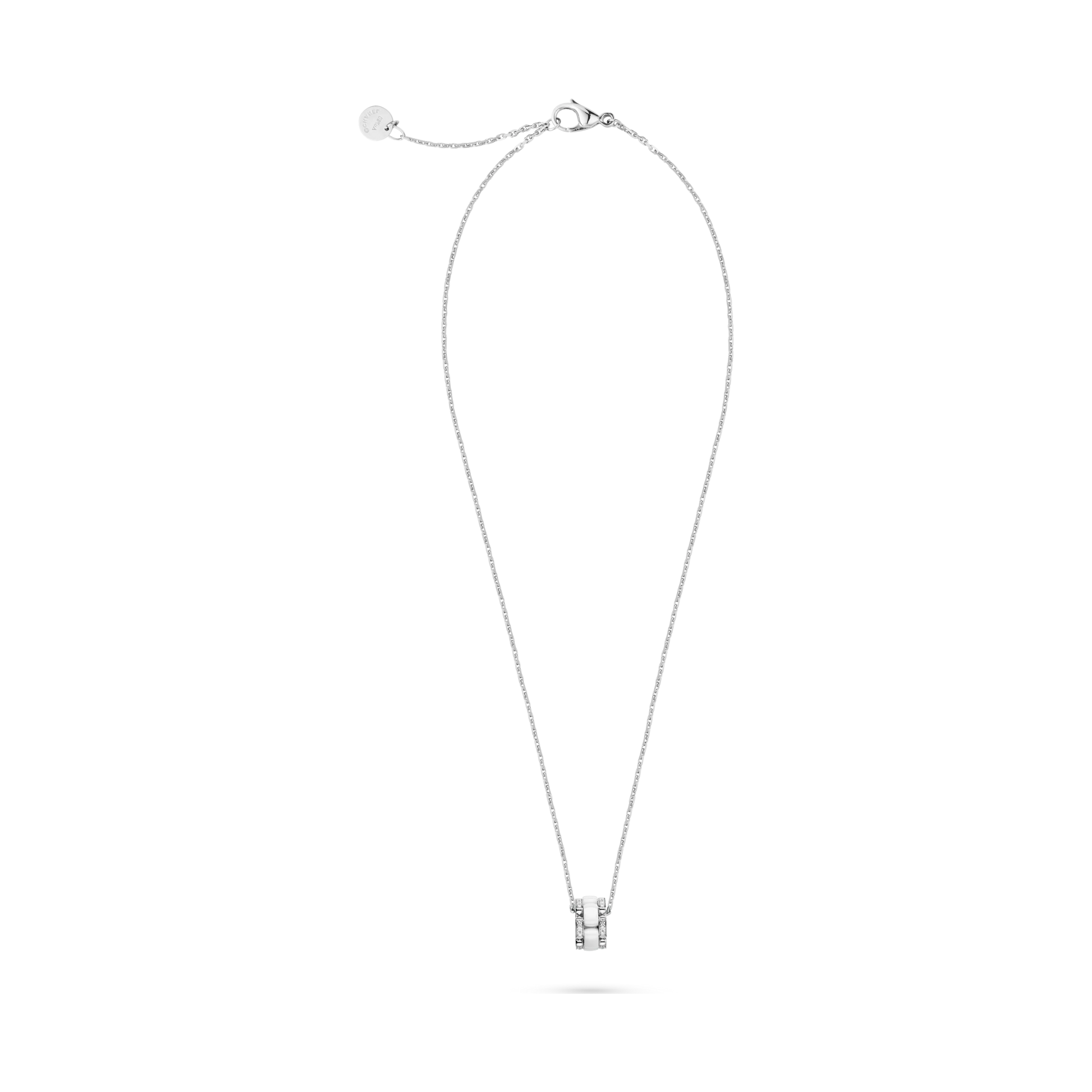 The necklace features a geometric design with a modern aesthetic of contrasts, and the precision ceramic details echo the J12 watch.