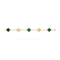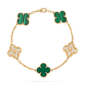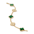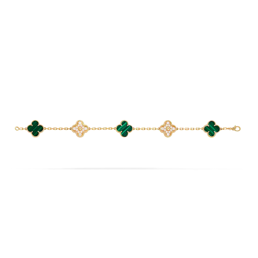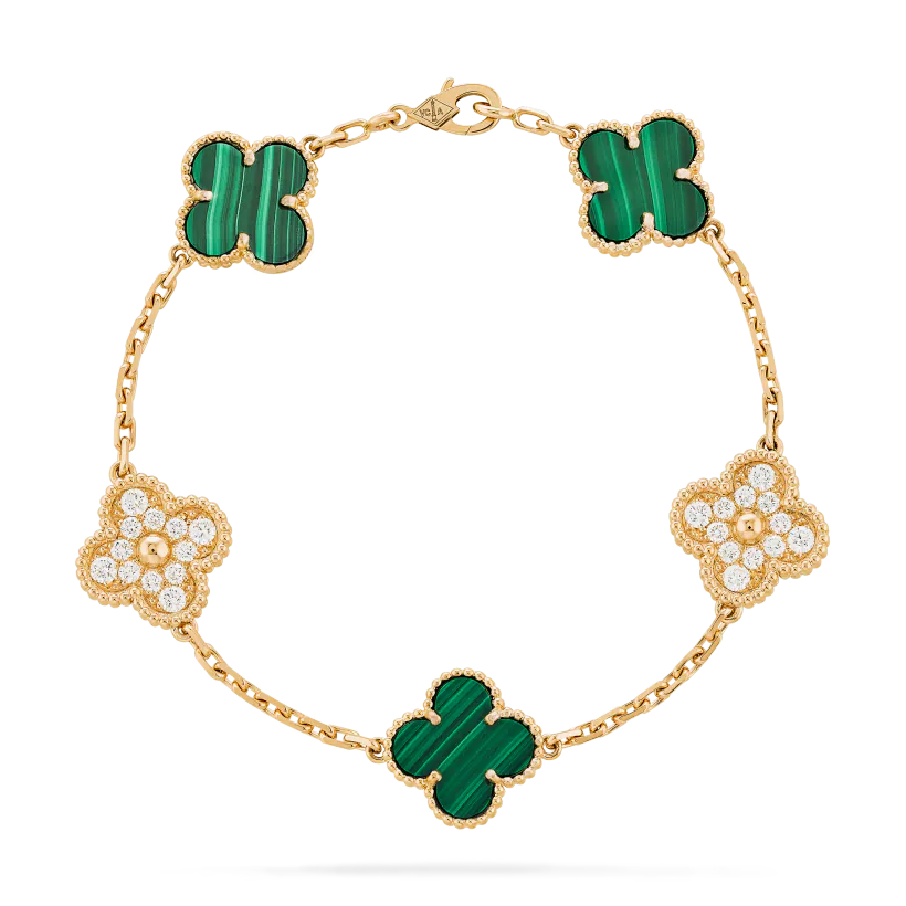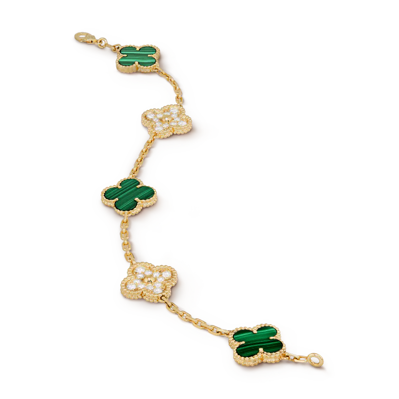 Vintage Alhambra bracelet, 5 motifs, 18K yellow gold, malachite, round diamonds; diamond quality DEF, IF to VVS.