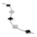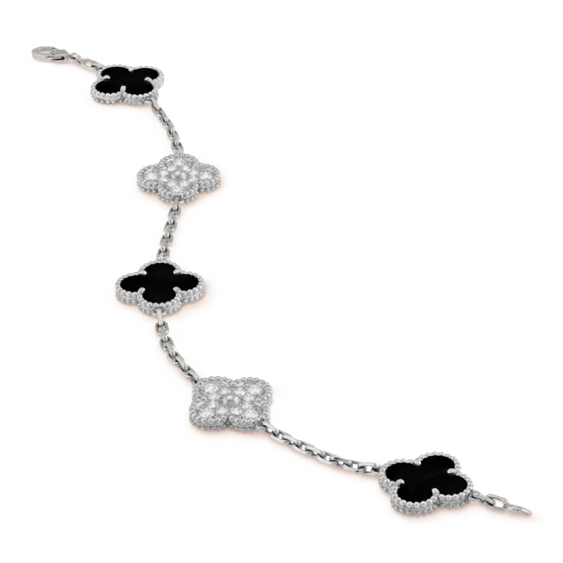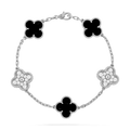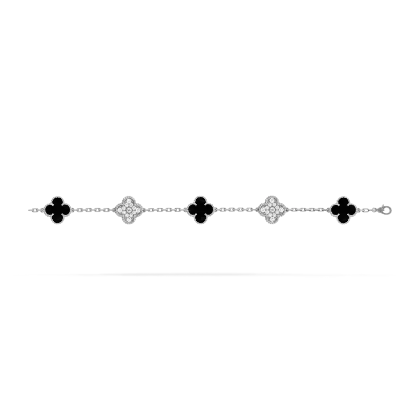 复古 Alhambra 手链,5 个三叶草图案,18K 镀铑白金,缟玛瑙,圆形钻石;钻石品质 DEF、IF 至 VVS。